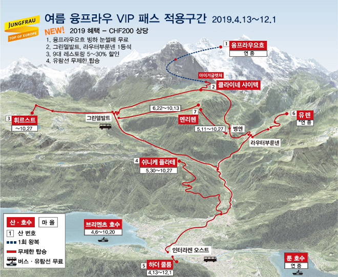여름 융프라우 VIP 패스 요금 및 혜택[2019.4.13-12.1] VIP 패스 요금 패스 기간 할인쿠폰 소지자 * Swiss Half Card,스위스패스 중복할인 (사용일 기재) 유스 요금 (만16~25세) ** 어린이 요금 (만 6~15세) 1일 CHF175 CHF170 CHF160 CHF30 2일 CHF195 CHF185 CHF175 CHF30 3일 CHF215 CHF200 CHF185 CHF30 4일 CHF235 CHF215 CHF200